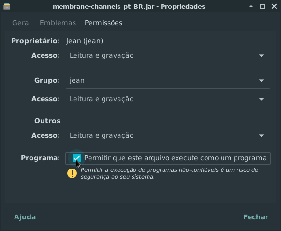 3- Agora clique em “Permitir que este arquivo execute como um programa” e clique em *Fechar*!